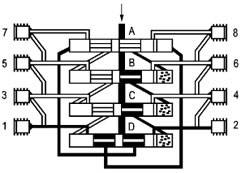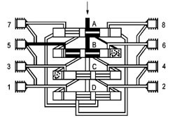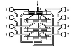 當(dāng)活塞D打通通向活塞A左側(cè)終端的連接通道后,潤滑劑流動并將活塞A向右推動。位于活塞A前右側(cè)的潤滑劑輸送到排出口1。